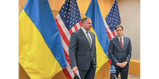 Head of the Office of the President of Ukraine Andriy Yermak and U.S. Secretary of State Marco Rubio, address the media after closed-door talks at the U.S. Mission in Geneva, Switzerland, November 23, 2025.