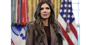U.S. Homeland Security Secretary Kristi Noem looks on as U.S. President Donald Trump (not pictured) meets with the White House Task Force on the FIFA World Cup 2026 in the Oval Office at the White House in Washington, D.C., U.S., November 17, 2025.