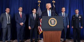 U.S. President Donald Trump speaks as White House Deputy Chief of Staff Stephen Miller, CIA Director John Ratcliffe, Secretary of State Marco Rubio, Secretary of Defense Pete Hegseth and General Dan Caine, Chairman of the Joint Chiefs of Staff, look on during a press conference following a U.S. strike on Venezuela where President Nicolas Maduro and his wife, Cilia Flores, were captured.PHOTO | REUTERS