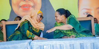 Chama Cha Mapinduzi (CCM) parliamentary candidate for Kibamba Constituency, Angellah Kairuki (right), exchanges views with CCM campaign coordinator for Dar es Salaam and Coast regions, Hawa Ghasia, during a campaign rally in Goba Ward. PHOTO|HELLEN NACHILONGO