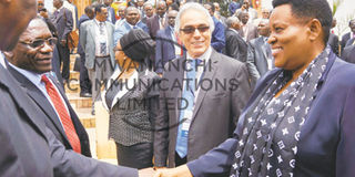 Prime Minister Mizengo Pinda greets Tanzania Appeals Court Judge Stella Mugasha after he opened the Judicial Dialogue Debate held in Arusha on Wednesday. Among other issues, the forum discussed governance in the African continent. PHOTO | CITIZEN PHOTOGRAPHER