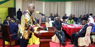 Former CCM Secretary General Mr Abdulrahman Kinana speaks to CCM MPs during a dinner event that they held on Tuesday night to bid farewell to him and welcome the new party SG Dr Bashiru Ally. Photo Edwin Mjwahuzi