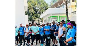The Head of Aga Khan University, Tanzania, Prof Eunice Pallangyo (third from left), together with officials from institutions under the Aga Khan Development Network (AKDN), prepares to take part in a walk aimed at promoting mental health, teamwork and environmental cleanliness. The event took place in Dar es Salaam on Saturday, October 11, 2025. PHOTO| BAKARI KIANGO