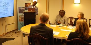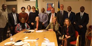 Tanzania’s Ambassador to Sweden, Mr Mobhare Matinyi (centre), poses for a group photo with Swedish investors and embassy officials after a meeting at the Tanzanian Embassy in Stockholm.