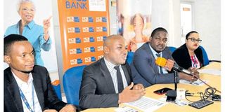 Mwalimu Commercial Bank Plc alternative delivery channels manager John Mhina (second left) speaks in Dar es Salaam on Wednesday. From left: credit officer Isaya Hagamu, head of business development and marketing Valence Luteganya and the bank’s marketing manager Rahma Ngassa. PHOTO | VENANCE NESTORY