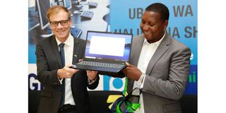 Prof Adolf Mkenda, education minister (right) launching the distribution of ICT equipment schools, teacher training colleges and to quality administrators yesterday, with him is the Sweden’s Ambassador to Tanzania, Mr Anders Sjoberg. PHOTO | COURTESY