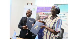 Vice-Chancellor of the University of Dar es Salaam, Prof William Anangisy and FAO Representative Dr Tupo Nyabenyi exchange documents during the launch of the TanFishMarket digital marketplace platform. PHOTO|ROSEMARY MIRONDO