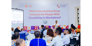 Vodacom Tanzania Foundation Manager, Ms Sandra Oswald speaks during a forum organised jointly with the CEO Roundtable of Tanzania ( CEOrt) through program titled Think Equal, Lead Smart ( TELS) to discuss challenges hindering persons with disabilities from accessing employment opportunities. PHOTO | COURTESY