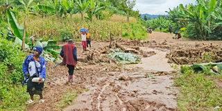 Some residents walk through the path linking the villages of Lupepo and Nkunga in Rungwe District, Mbeya Region, following flood-triggered landslides. PHOTO | SADAM SADIK