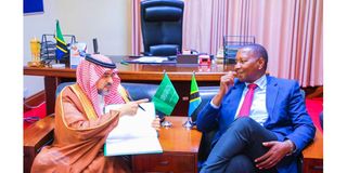 Education, Science and Technology minister, Prof Adolf Mkenda (Right) and Saudi Arabian Ambassador to Tanzania, Yahya Ahmed Okeish, discuss education collaboration strategies, including scholarship opportunities for Tanzanian students. The Saudi Arabia government has increased scholarship slots for Tanzanian students from 90 to 127. PHOTO | COURTESY