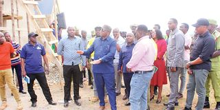 Mara Regional Commissioner, Col Evans Mtambi, speaks during an inspection tour of houses under construction for residents compensated to pave the way for the expansion of the Barrick North Mara mine. He was accompanied by regional leaders and senior mine officials. PHOTO | COURTESY