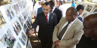 Palestine Embassy Charge D’ Affairs to Tanzania Derar Ghannam, briefs the Director of the Middle East Department in the Ministry of Foreign Affairs and International Cooperation Mr Abdallah Kilima (centre) on liberation photos at the Tanzania-Mozambique Center for Foreign Relations (CRF) centre yesterday during an exhibition to mark Palestiniane International Day of Solidarity in Dar es Salaam. PHOTO | ANTHONY SIAME