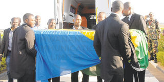 The body of the Industry and Trade minister Abdallah Kigoda is loaded into an ambulance at Julius Nyerere International Airport yesterday after arriving from India. PHOTO | SAID KHAMIS
