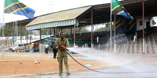 Dodoma firefighters and rescue police sprinkle water at Jamhuri Stadium yesterday to reduce dust as final preparations for the handing over ceremony of the proposed new constitution to President Jakaya Kikwete by the Constituent Assembly chairman Samuel Sitta today, story on page 3 PHOTO | EDWIN MJWAHUZI
