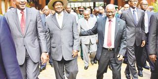 EAC Presidents Uhuru Kenyatta, President Yoweri Kaguta Museveni ,President John Pombe Magufuri and President Paul Kagame at the March regional summit in Arusha. President Magufuli announced at the summit that Uganda had decided to construct the oil pipeline through Tanzania. PHOTO|FILE