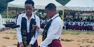 Winfrida Wilson, a visually impaired student, reads a speech on behalf of fellow students during the Form Six graduation ceremony at Lugalo Secondary School in Iringa Municipality. PHOTO | CHRISTINA THOBIAS