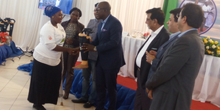 The Deputy Minister of State in the Prime Minister’s Office (Policy, Parliamentary Affairs, Labour, Employment and Youth and the Disabled), Mr Anthony Mavunde (centre) presents an artificial limb to Ms Mwanaisha Mohammed during an event where the Dar es Salaam-based Kamal Group donated a total of 108 artificial limbs to the disabled people in the city at the weekend. From left is: a lecturer from Mzumbe University Dar es Salaam Campus, Dr Coretha Komba, a Kamal Group director, Mr Satyam Gupta, Kamal Group founder, Mr Santosh Gupta, Kamal Group chairman, Mr Gagan Gupta and director, Mr Sameer Gupta. PHOTO|VENANCE NESTROY