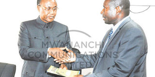 Permanent secretary in the ministry of Lands, Housing and Human Settlements Development Alphayo Kidata hands over a document on working skills to his minister William Lukuvi during the Ministry workers meeting in Dar es Salaam yesterday. PHOTO | SALIM SHAO
