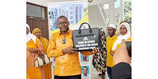 Zanzibar NLD presidential candidate, Mfaume Khamis Hassan, displays a bag containing presidential nomination forms after picking them from the Zanzibar National Electoral Commission on August 31, 2025. PHOTO | COURTESY