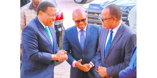 The Prime Minister, Dr Mwigulu Nchemba, greeting the Commissioner for Ethics of Public Leaders, retired Judge Sivangilwa Mwangesi (right) before addressing the leaders of the ethics secretariat in Dodoma yesterday. In the middle is the Minister of State, Office of the President (Services and Good Governance), Mr Ridhiwan Kikwete. PHOTO | PMO