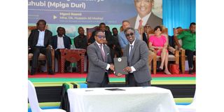 NBC Bank’s Director of Retail Banking, Elibariki Masuke (left), and Zanzibar Ferry Development Company Limited Managing Director, Jaffer Machano (right), exchange congratulatory gestures after signing a cooperation agreement to support the construction of the Maruhubi (Mpiga Duru) Passenger Ferry Terminal through a concessional loan, during the foundation stone–laying ceremony officiated by Zanzibar’s Second Vice President, Hemed Suleiman Abdullah (centre).