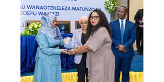 Deputy Minister, Prime Minister’s Office – Labour, Employment and Industrial Relations, Rahma Kisuo (MP), presents the Best Employer Award for the Internship Programme to the Acting Head of Human Resources at NBC Bank, Grace Mgondah, during the Employers’ Conference in Dar es Salaam, as Deputy Permanent Secretary Zuhura Yunus looks on.