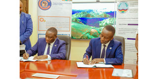 ECSA-HC director general, Dr Ntuli Kapologwe (left), and FP-ICGLR secretary general, Ambassador Dr Deo Mwapinga sign documents in Dar es Salaam on Sunday October 26. PHOTO | HERIETH MAKWETTA