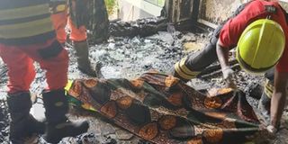 Bodies of children who died in a fire accident in Katanini, Karanga Ward, covered by firefighters from the Kilimanjaro Regional Fire and Rescue Service. PHOTO | COURTESY