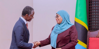 President samia Suluhu Hassan with the UN Secretary-General's special representative to the African Union, Mr Parfait Onanga-Anyanga, after holding talks at Chamwino State House in Dodoma. PHOTO | STATE HOUSE