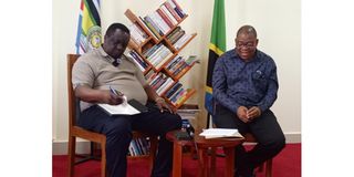 Njombe Regional Commissioner, Mr Anthony Mtaka (right), addresses journalists on Wednesday, April 29, 2016. Left is the Trade Union Congress of Tanzania (Tucta) President, Mr Tumaini Nyamhokya. The press conference to announce President Samia Suluhu Hassan as this year's May Day celebrations took place at the Njombe Regional Commissioners' Office. PHOTO l SEIF JUMANNE