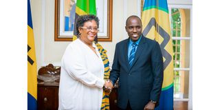Tanzania’s Deputy Prime Minister, Dr Doto Biteko, and Barbados' Prime Minister, Mia Mottley, shaking hands in a historic meeting to enhance cooperation between their nations.