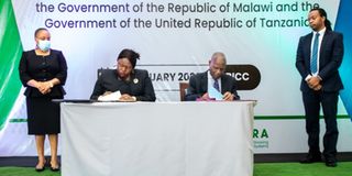 Tanzania’s Minister for Industry and Trade, Ms Judith Kapinga, and Malawi’s Minister of Industrialisation, Business, Trade and Tourism, Mr Simon Itaye, sign the Simplified Trade Regime (STR) bilateral agreement to boost cross-border trade and expand opportunities for women and youth traders between Malawi and Tanzania. PHOTO | COURTESY