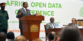 President Jakaya Kikwete addresses the Africa Open Data conference in Dar es Salaam yesterday. Centre is Chief Secretary Ombeni Sefue and World Bank country director Bella Bird. PHOTO | OMAR FUNGO