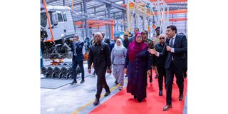 President Samia Suluhu Hassan is taken around the Saturn Corporation-owned truck assembly line in Dar es Salaam on Thursday, May 9, 2024. PHOTO | COURTESY