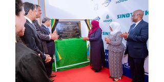 President Samia Suluhu Hassan unveils the plaque to officially launch the assembly line for Howo trucks in Dar es Salaam on Thursday, May 9, 2024. The assembly line is owned by Saturn Corporation. PHOTO | CORTESY