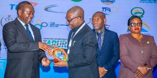 Arusha District Commissioner Joseph Mkude (left) presents an award to Tanzania Ports Authority (TPA) Director of Planning, Quality and Risk Management, Dr Boniface Nobeji, in recognition of outstanding performance during the 18th Joint Transport Sector Performance Review Meeting held in Arusha recently. PHOTO | BERTHA ISMAIL