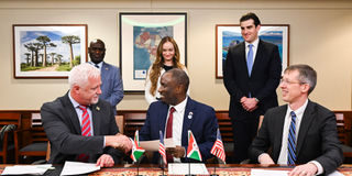 Lifezone Chief Executive Officer Chris Showalter, Burundi's Minister of Mineral Resources, Energy, Industry, Trade, and Tourism Dr Hassan Kibeya, and U.S. Deputy Assistant Secretary of State for Central Africa and Commercial Engagement in the Bureau of African Affairs Sarah Troutman, at the signing of an exclusivity agreement on the Musongati nickel laterite project at the U.S. Department of State, Washington, D.C., alongside representatives of the United States government and other stakeholders. PHOTO | COURTESY