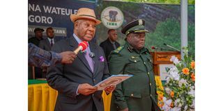 Major General (Retired) Hamis Semfuko delivers a statement on the promotion of officers at Tawa Headquarters in Morogoro on 21 February 2026, shortly before formally conferring their new ranks. To his left stands the Acting Commissioner for Conservation, Mlage Yussuf Kabange.