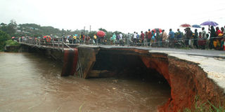 Dar es Salaam residents walk to their various destinations instead of driving, riding or taking a commuter bus after floods damaged Mzinga Bridge on Kilwa Road in Mbagala yesterday. The ongoing downpour has distrupted transport system in virtually all parts of Tanzania’s commercial capital. PHOTO | JOSEPH ZABLON
