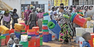 Women, men and children wait for their turn to draw water at a supply centre for domestic use. Photo | FILE