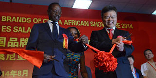 SINO-TANZANIA PARTNERSHIP: Trade and Industry Minister Abdallah Kigoda joins China envoy to Tanzania Li Yuoqing in a ribbon-cutting ceremony to mark the start of a four-day exhibition of Chinese products at the Diamond Jubilee Hall in Dar es Salaam on Thursday. PHOTO | SAID KHAMIS