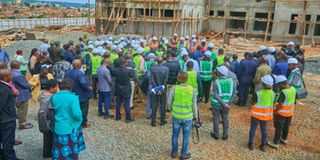 The Njombe Regional Advisory Committee, led by the Regional Commissioner Anthony Mtaka gathers at one of the facilities being constructed at the University of Dodoma (UDOM) Njombe Campus. PHOTO | COURTESY.