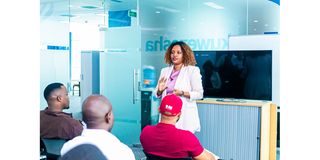 Head of the Stanbic Biashara Incubator, Kai Mollel, speaking during a training workshop for emerging innovators (startups) that brought together ten innovative startup companies from Uganda and fifteen from Tanzania.
