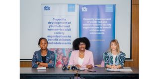 Deputy Executive Director / Head of Program Quality and Learning at the Foundation for Civil Society (FCS), Ms. Cynthia Bavo Harris, speaks to the media during the launch of a capacity-strengthening initiative aimed at empowering youth- and women-led civil society organizations in Dar es Salaam, Zanzibar, and Songwe Region. She is flanked by the Community Development Officer for Dar es Salaam Region, Ms. Given Sure (left), and the Chief of Child Protection at UNICEF, Ms. Miranda Armstrong (right). PHOTO | COURTESY
