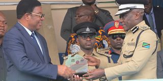 Prime Minister Kassim Majaliwa receives an award on behalf of President Samia Suluhu Hassan from Inspector General of Police Camillius Wambura in Dar es Salaam on July 22, 2023. The Police Force presented the award in honour of President Hassan's recognition of the key role played by women police officers. PHOTO | PMO