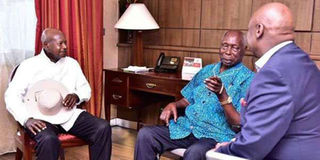 Ugandan President Yoweri Museveni (right) on March 29, 2019 when he paid a courtesy call on retired president Daniel Moi (centre) at this Kabarnet Gardens home in Nairobi. COURTESY PHOTO