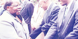President Benjamin Mkapa (left) shakes hand with the former permanent secretary in the ministry of Energy and Minerals, Patrick Rutabanzibwa at the inauguration of Tanesco’s Kihansi Hydropower Project on July 10, 2000. PHOTO | FILE