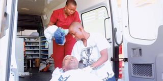 Dr Sengondo Mvungi, being taken from the ambulance by medics immediately after he arrived at the Muhimbili Orthopedic Institute (MOI) from the Aga Khan Hospital where he had been taken for tests. Dr Mvungi sustained serious injuries in the head after armed robbers raided his residence at Kibamba on the outskirts of Dar es Salaam in the wee hours yesterday. PHOTO | VENANCE NESTORY