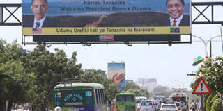 A billboard welcoming US President Barack Obama straddles Nyerere Road in Dar es Salaam yesterday ahead of his arrival in the country today. PHOTO|EMMANUEL HERMAN