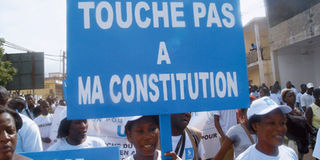 A demonstrator holds a banner reading “Don’t touch our Constitution” on November 21, 2014 in Lome, as opposition called for a protest asking for political reform to limit a president to a maximum two five-year terms of office. President Faure Gnassingbe is serving third term of office -- the current maximum allowed by the constitution.
